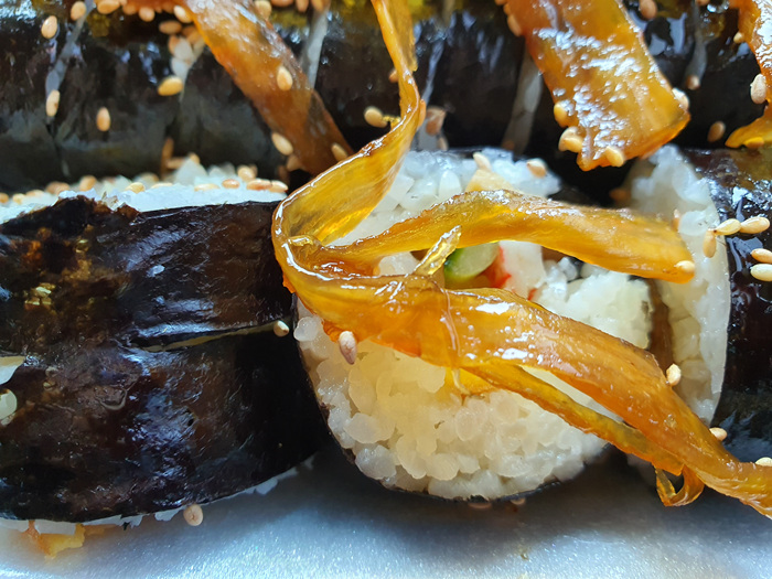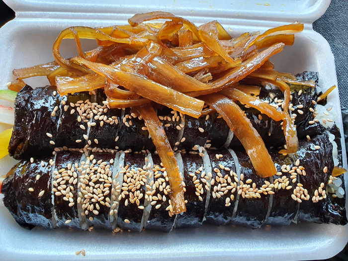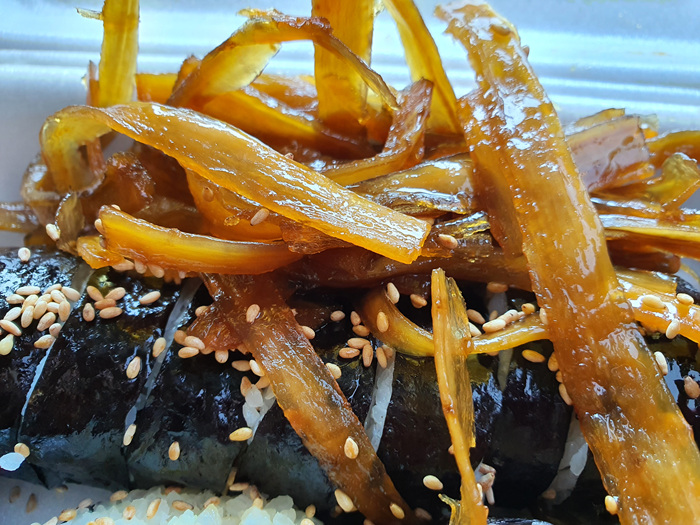 김밥 2줄 위에 넉넉하게 올려진 우엉반찬이다. 김밥 1줄 3,000원