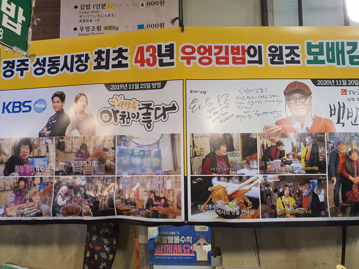 내가 간 곳은 우엉의 원조라고 적힌 한 김밥집이다. 이곳은 각종 방송에서도 많이 소개된 곳이라고 한다. 역시나 이곳 주변엔 방송에 나왔다는 현수막이 붙어 있었고 김밥집 사장님은 열심히 김밥을 말고 계셨다.