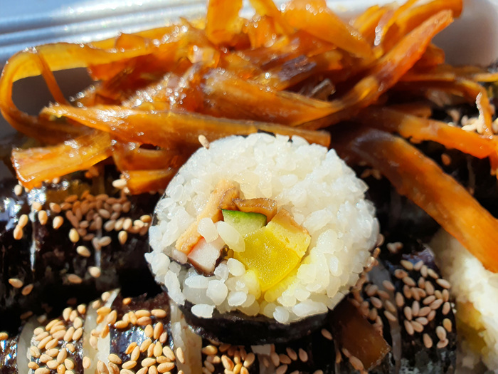 김밥 2줄 위에 넉넉하게 올려진 우엉반찬이다. 김밥 1줄 3,000원