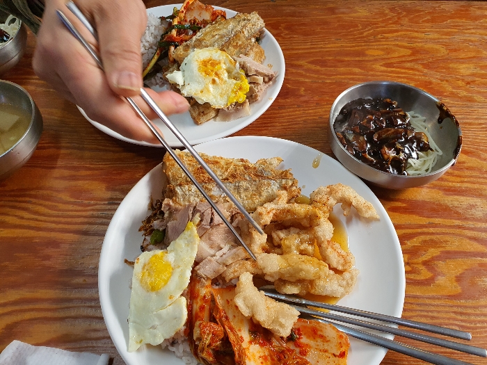 탕수육이 주메뉴다 보니 짜장면도 있었다. 나름대로 구색을 갖춘 식단이었다. 그외 갈치구이, 수육과 각종 반찬도 나온다.
