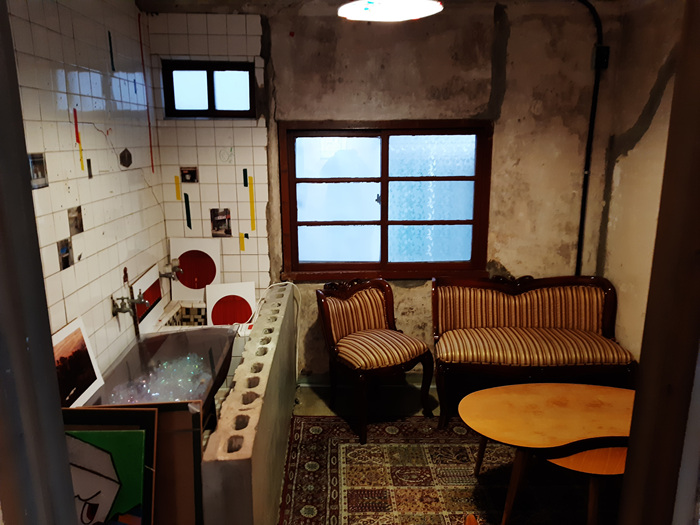 조명도 화려한 듯 하지만 그렇게 화려하지 않습니다. 감성 제대로 느끼게 하는 그런 조명입니다. 마치 옛날 카바레 같은 느낌도 들고...그러고 보니 벽에 흰 타일도 이곳이 욕실이나 방이 아니었나하는 생각을 지울수 없네요. 1층은 이렇듯 전체를 다 트임을 해 넓은 거실 같지만 2층은 방 하나 하나 옛 모습을 그대로 보존되어 구경할만 하더군요.