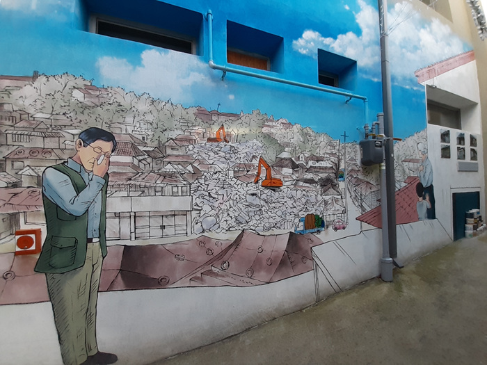 마을이 사라지면서 뿔뿔이 흩어졌던 동네 이웃들 그리고 그들만의 추억이 벽에 그려진 그림 한 점을 보니 그대로 느껴지는 듯합니다.
