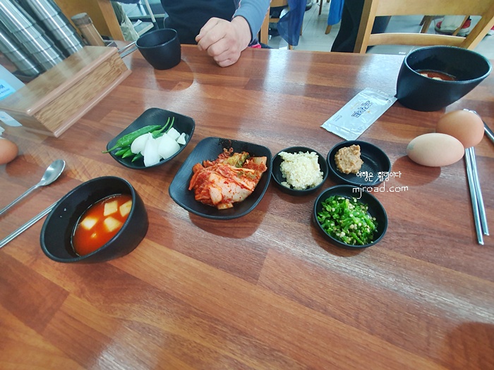 해장국을 주문하면 여느 해장국집과 비슷하다. 깍두기, 배추김치, 고추, 양파등이 나온다. 해장국에 같이 넣어 먹는 간마늘과 땡초 다진것도 나오고 날 달걀이 나온다. 날 달걀은 해장국에 넣어서 먹는다.