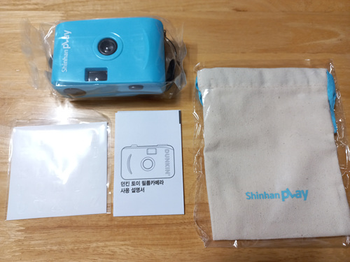 작은 박스에 이렇게 들어 있습니다. 필름카메라, 사용설명서, 카메라파우치, 스티커가 들어 있어요