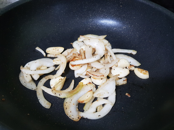 그다음 예열된 후라이팬에 오일을 넣은 뒤 양파, 마늘, 허브솔트를 넣고 볶습니다.