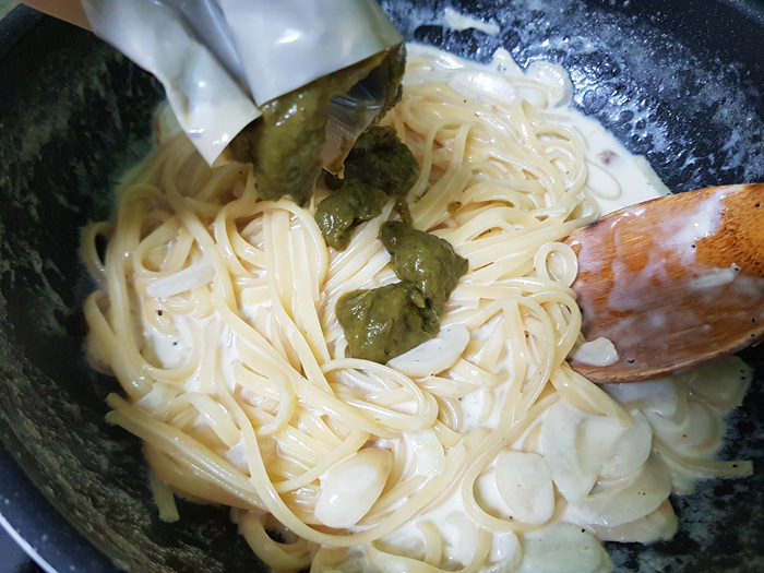 파스타 요리가 다 되면 불을 끄고 바질 파스토를 넣어 섞어 줍니다.