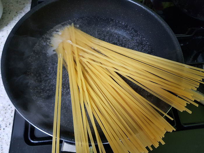 에어프라이어에 빵을 굽는 동안 파스타를 삶습니다.