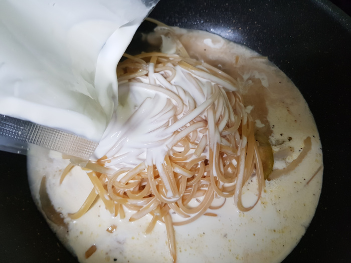 팬에 면수 1컵(종이컵 기준) 파스타, 크림을 넣고 3~ 5분 정도 잘 섞어 줍니다.