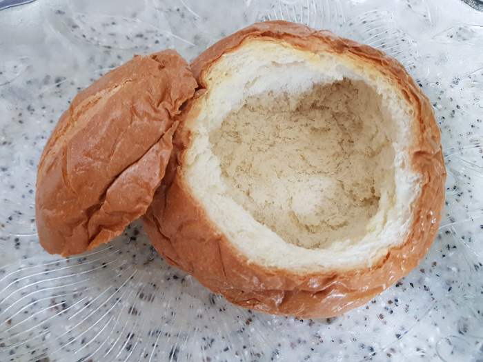 칼로 먼저 윗면을 자른 뒤 숟가락으로 파스타가 들어갈 수 있게 볼을 만듭니다.