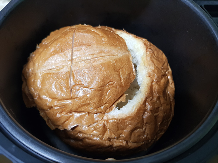 빵 안쪽의 부드러운 부분을 도려 낸 후 뚜껑을 다시 덮은 후 에어프라이어에 180도온도에 5분 구워 줍니다.