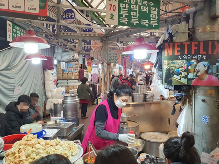 무엇보다도 광장시장에 활기를 준건 바로 넷플릭스 덕분이었습니다. 오징어게임으로 이미 각종 상을 휩쓸었고 다양한 방송들이 넷플릭스로 알려지다 보니 지금은 전국이 아닌 세계적인 명소가 되어 있더라고요. 넷플렉스에 나와 난리가 난 만두국, 수제비집은 한시간 이상 줄을 서야 먹을수 있을 만큼 난리도 아니었습니다.