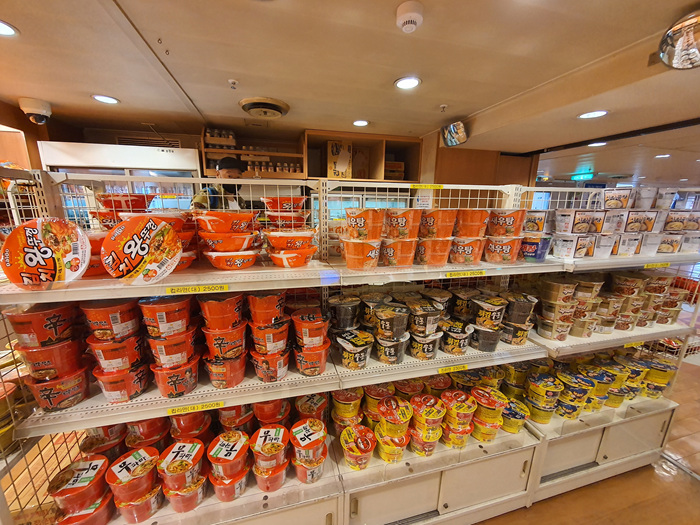 여객선에서 제일 많이 나가는 음식 중 하나는 바로 컵라면입니다. 간편하게 즐길 수 있고 포만감도 있어 한끼 식사로도 충분합니다. 물론 배 안에서 잘 드시는 분에 한하지만요. 멀미 하시는 분들은 그냥 빈속에 가시길... ^^;;;;;;