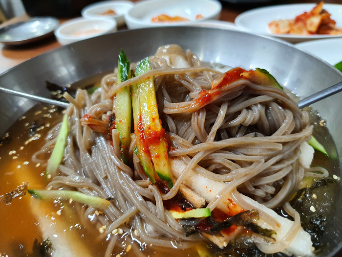 순대국밥이 나오고 조금 있다가 막국수도 같이 나왔다. 날씨도 추운데 왠 얼음 동동 들어간 막국수냐고 생각할 수 있는데 사실 나 또한 막국수라 해서 비빔으로 나오는 줄 알았기에 조금 당황했긴 했다. 그래도 면발은 얼음 동동 들어간 육수에 있어서 그런지 쫄깃함은 배가 되었다.