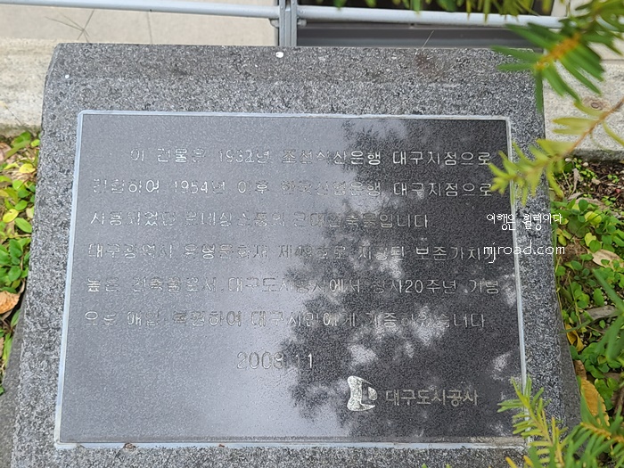 이곳은 일제 강점기에 지어진 건물로 르네상스 양식의 고풍스러운 느낌이 있다. 대구 근데 역사관은 1932년 조선식산은행 대구지점으로 건립되었으며 1954년 부터 한국산업은행 대구지점으로 이용된 근대문화 유산이다. (네이버 출처)