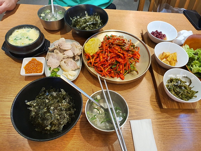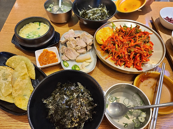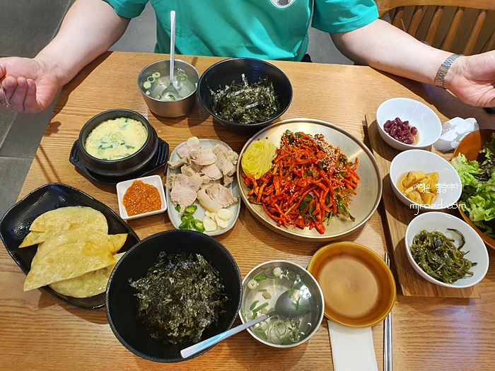 2인 분치고는 나름대로 괜찮은 상차림이다. 밥은 김이 올려져 있어 비벼 먹기 쉽게 큰 그릇에 나왔고 달걀찜을 비롯해 수육, 각종 반찬 그리고 쌈이 나왔다.