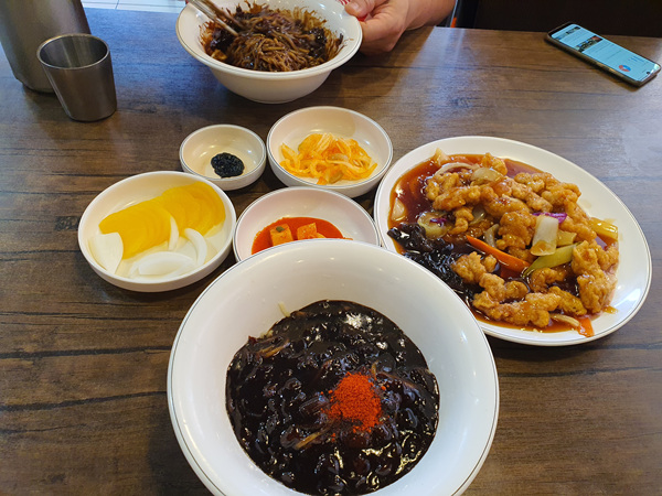 여행 중에는 잘 먹어야겠기에 우린 탕수육 세트를 주문했습니다. ( 탕수육, 짜장면 2그릇 나오는 세트메뉴 ) 보통 탕수육 세트를 주문하면 탕수육이 진짜 작은 것으로 나오는데 이곳은 그냥 요리 하나가 나오더라고요. 물론 짜장면 양도 기본으로 주문하는 그런 짜장면 양이라 놀랐습니다.