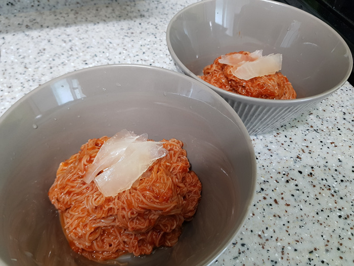 그런데..면이 풀을 쑨양 흐물흐물  ㅜㅜ 이유는 이랬습니다. 면을 너무 많이 삶은 탓이었습니다. 그러고 보니 면을 얼마나 삶아야 하는지 자세히 설명을 읽지 않았네요. 면 삶는 시간은 50초 ..생각보다 짧은 시간에 적잖이 놀랬네요. 다음엔 면 삶는 시간도 잘 체크해야겠습니다. ^^;;;;;;