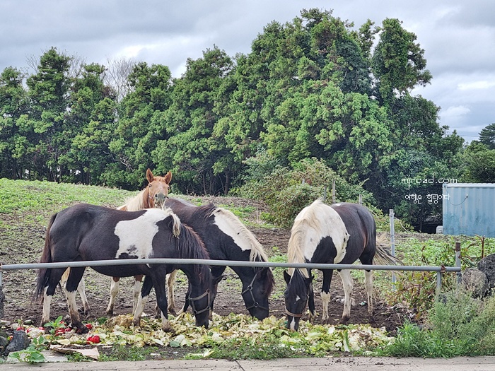 차들이 씽씽 달리는 도로 바로 옆인데도 아랑곳 하지 않고 먹는데만 집중한다. 누가 지나가도 그대로 있을 말들의 모습이다. 제주도 여행 하다보면 이런 풍경을 자주 본다. 그럴때마다 청정 제주라서 가능한 풍경이 아닐까하는 생각도 들고 평화로워 보여서 좋다.