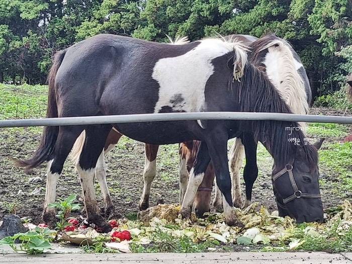 사각사각 소리를 내며 맛있게 먹고 있는 것은 배추다. 예전에는 무를 먹는 모습도 참 특이 했었는데 이번에 배추에 피망을 먹고 있었다. 말들의 모습도 어찌나 깨끗하던지 역시 푸른 자연에서 살고 있는 말은 뭔가 다르다는 생각도 들었다.