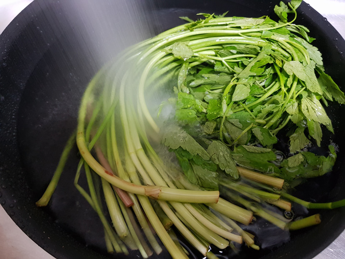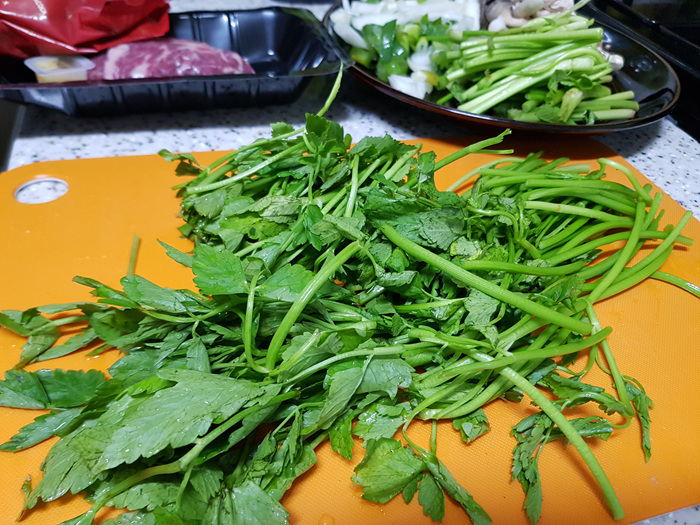 미나리와 버섯은 깨끗하게 한 번 헹군 뒤 먹기 좋게 썰어 줬어요.