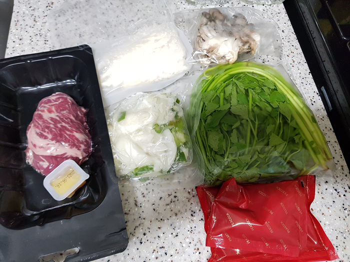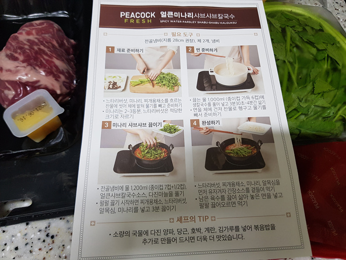 얼큰 미나리 샤브샤브 칼국수 밀키트 구성은 미나리, 버섯, 각종 채소와 간 마늘, 샤브용 쇠고기, 칼국수 그리고 양념이 들어 있었습니다. 채소도 싱싱하고 너무 좋더라고요.