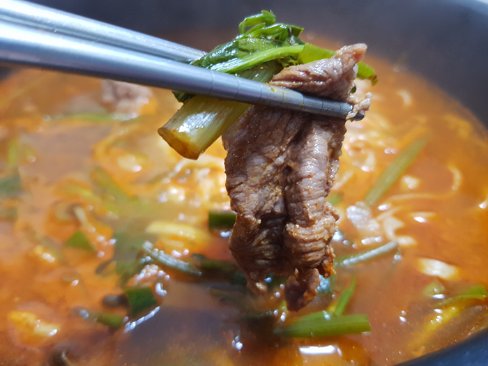 물 1200ml에 양념을 넣고 팔팔 끓으면 채소를 넣고 한소쿰 끓인 뒤 쇠고기를 넣어 드시면 됩니다. 전 가스레인지에 한 번 끓인 뒤 준비된 버너 위에 올려 편하게 앉아서 먹었어요.