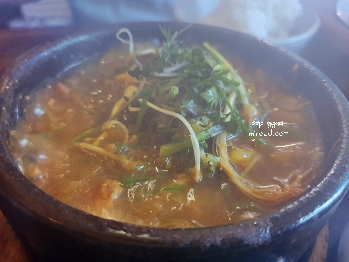 한 상 가득하게 차려진 정갈한 밥상이다. 이곳은 사실 된장찌개 맛이 일품이라 먹을만 하다. 마치 시골 할머니댁에서 먹던 그런 맛이 난다. 된장찌개는 달래랑 고기등 여러가지 재료가 많이 들어 있어 이것만으로도 한 끼 식사가 될 정도이다. 개인적으로 된장찌개가 제일 생각이 많이 날 정도다.