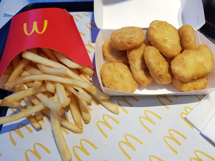 후렌치 후라이, 멕너겟, 소스 그리고 음료가 나왔습니다.