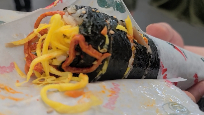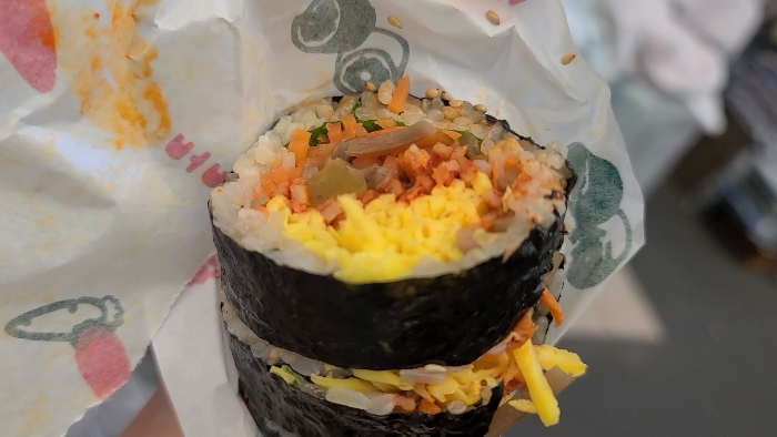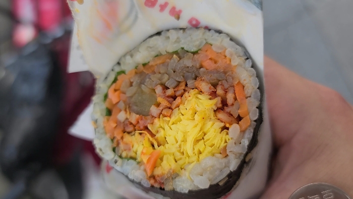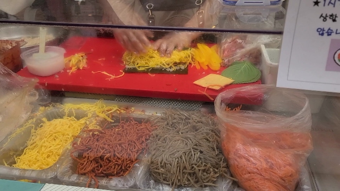 이곳 주변에서 다양한 먹거리를 먹어 볼거라 한개만 주문해 봤다. 김밥 마는 모습을 직접 볼수 있어 얼마나 많은 속재료가 들어 가는지 한 눈에 알수 있다.