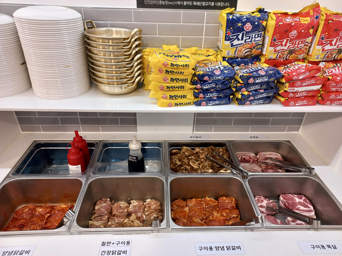 고기도 생고기, 냉동고기, 양념된 고기등 다양해 먹고 싶은 만큼 조금씩 가져다 구워 드시면 됩니다. 개인적으로 닭갈비 보다 고기류가 맛있었습니다.