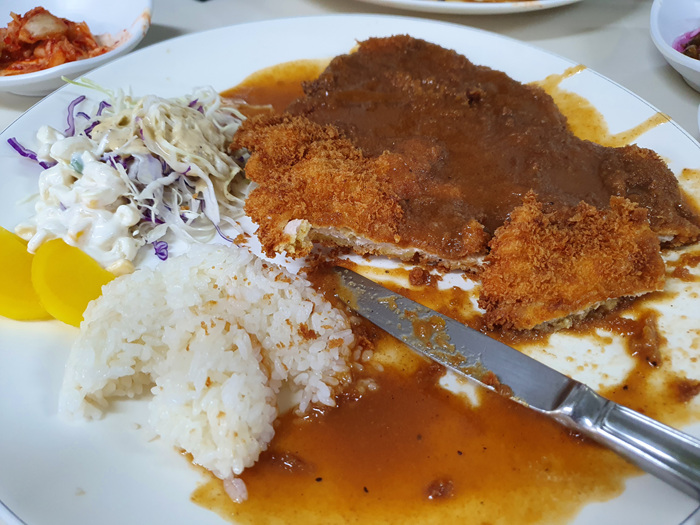 그냥 점심시간이라 밥 먹어야지 하고 가서 돈가스를 먹다 보면 거의 남기는 편인데 배가 엄청 고픈 상태라 그런지 평소보다 시간이 좀 걸리긴 했지만 다 먹고 왔네요.