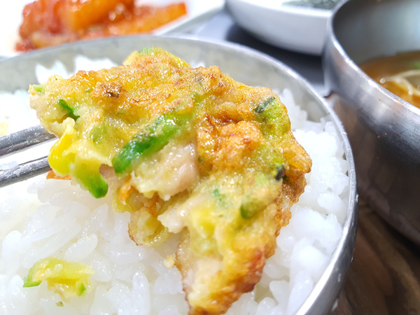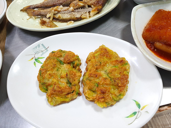 밥을 맛있게 먹고 있으니 먹기 좋은 크기로 만든 부침개도 나왔다.