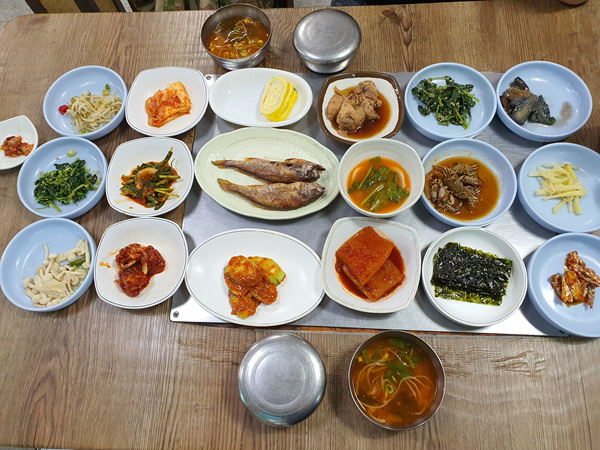주문 하자마자 한상 거하게 반찬이 놓였다. 역시 전라도 음식점이라는 말이 또 나왔다. 전라도 여행을 하다보면 음식점들 대부분 반찬이 정말 푸짐하게 나온다. 이곳도 그랬다. 백반 정식인데 이정도 반찬이면 한정식 수준 아닐까싶다.