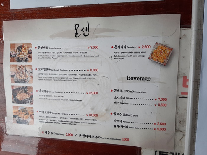 메뉴판은 밖에 보기 쉽게 붙여져 있으니 기다리면서 메뉴를 고르시면 됩니다. 우린 온센텐동과 새우, 온센타마고 추가를 했습니다. 추가할 경우 개수는 1개 나옵니다. 새우 1개, 타마고 1개