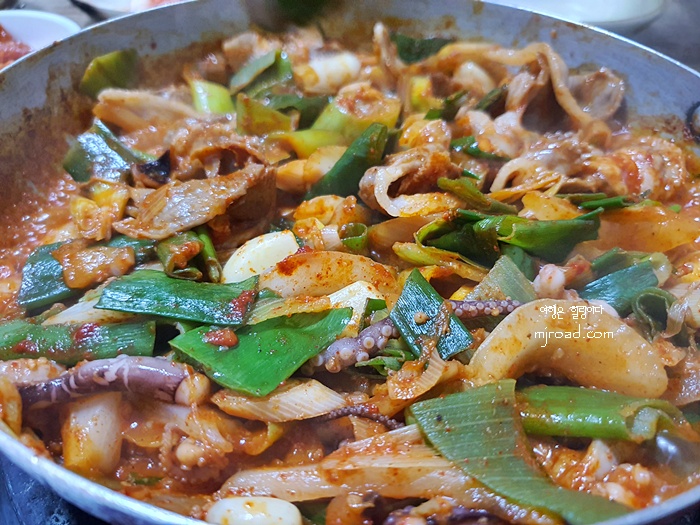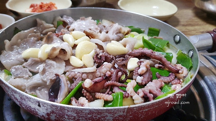 이곳에서 제일 많이 나가는 메뉴는 짬뽕이란 메뉴다. 짬뽕이라고 중국집 음식을 생각하면 안된다. 두 가지 메뉴를 섞어 나온다고 짬뽕이라고 했다. 낙지 + 돼지고기 두 가지가 섞어 나오는 메뉴이다. 가격은 1인 12,000원이다.