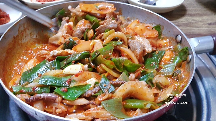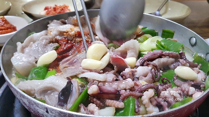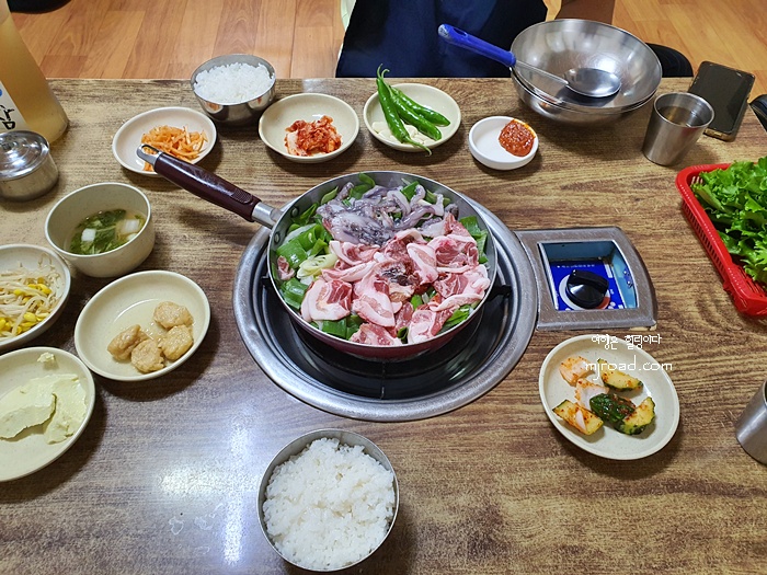 상차림은 여느 시골밥상집 같은 느낌이었다. 냄비에 낙지와 돼지고기가 담겨져 나오는데 생각보다 양이 푸짐했다. 그냥 낙지볶음 + 돼지볶음 섞어 놓은 메뉴라고 생각하면 된다. 물론 각각 메뉴를 주문해도 가격은 같다.