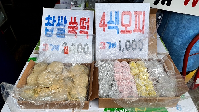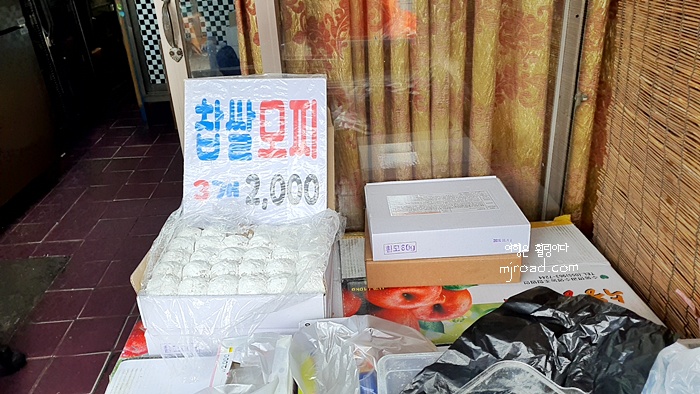 직접 만든건지 어디서 받아 온건지는 몰라도 하여간 가격이 저렴했다. 요즘에 이런 가격이 어디있을까? 찹쌀모찌 3개 2,000원 찹쌀쑥떡 3개 2,000원 4색 모찌 3개 1,000원이다.