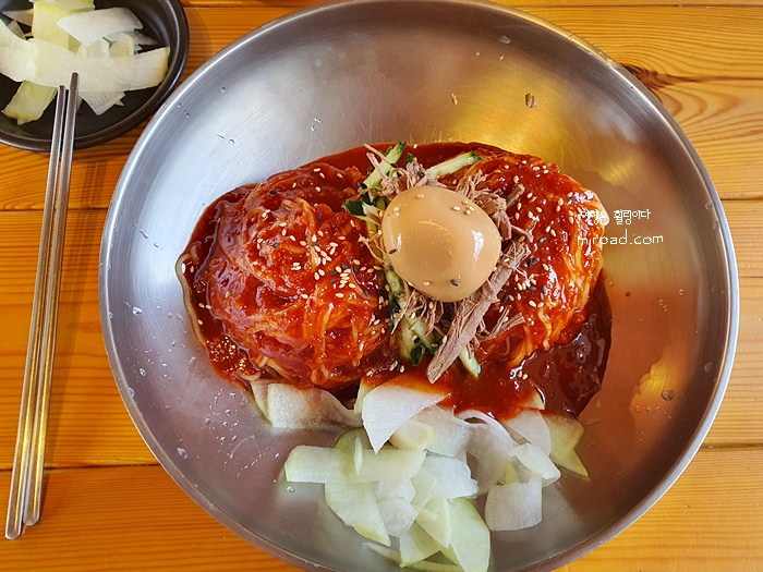 찬은 무 김치가 하나 나온다. 맛은 삼삼하니 매운 비빔밀면과 먹기에 이만한 반찬이 없을 듯 하다.