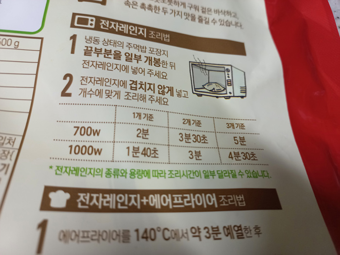참고로 전자렌지 뿐만 아니라 오븐이나 에어프라이어에 조리해 먹어도 된다. 단, 예열하고 기다리기 귀찮아 난 전자렌지를 택했다.