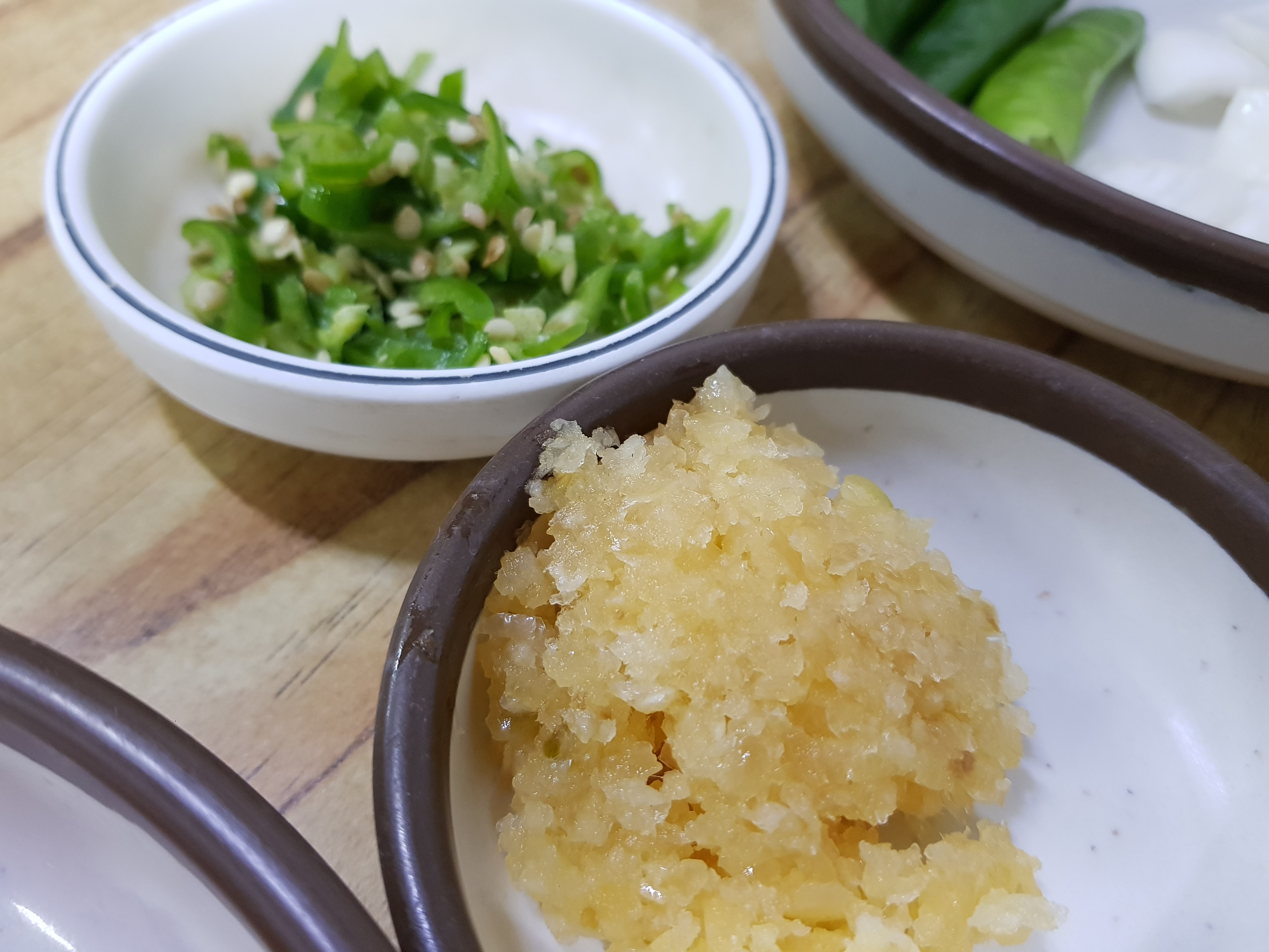 우린 해장국, 내장탕 각 하나씩 주문했습니다. 찬은 김치,깍두기, 고추, 양파와 탕에 곁들여서 먹는 간마늘, 땡초 다진거 이렇게 나옵니다.