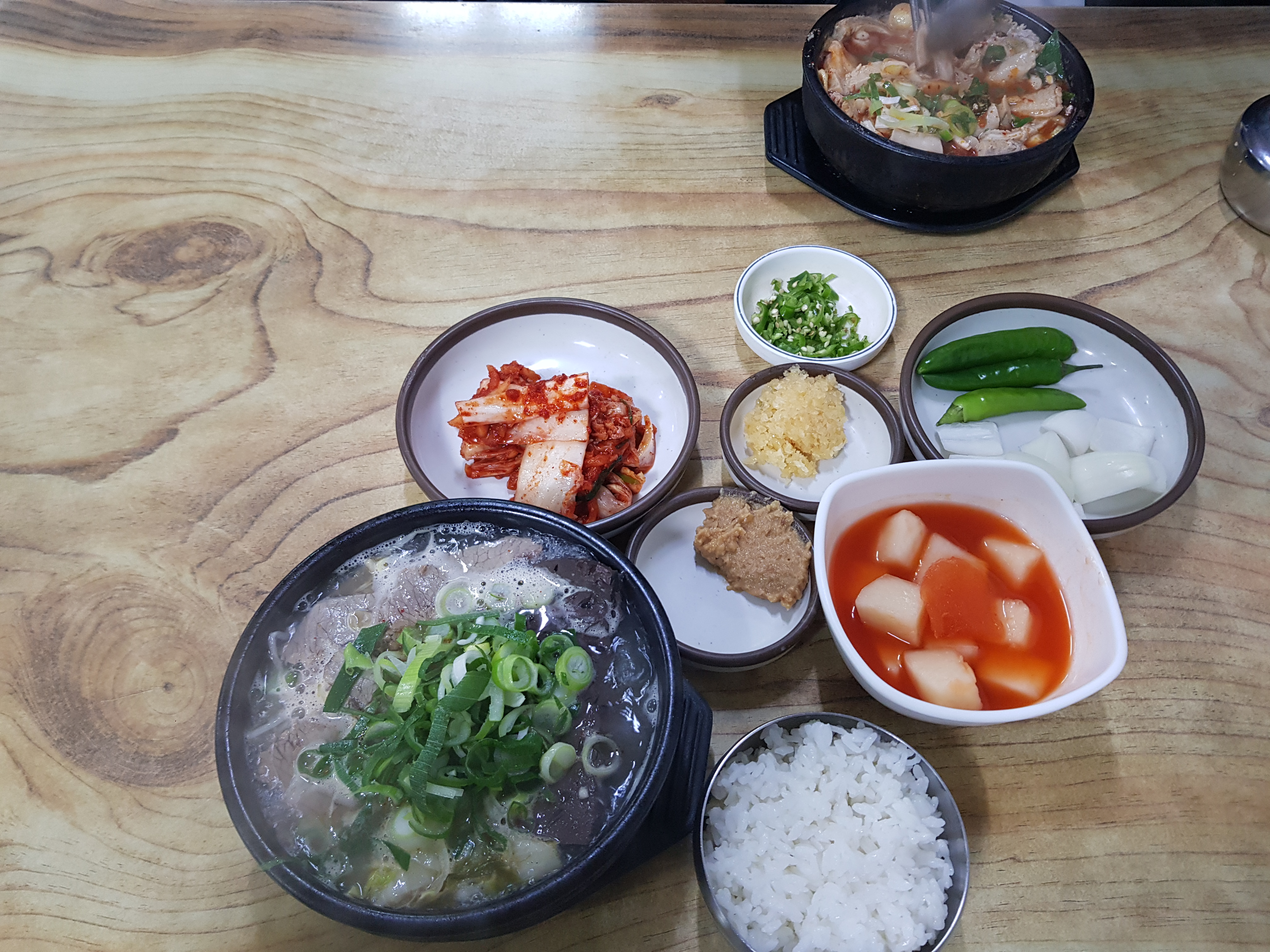 우린 해장국, 내장탕 각 하나씩 주문했습니다. 찬은 김치,깍두기, 고추, 양파와 탕에 곁들여서 먹는 간마늘, 땡초 다진거 이렇게 나옵니다.