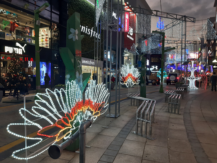 저녁이 되니 더 화려해진 광복동 거리입니다. 크리스마스와 연말을 맞아 새로 설치한 빛을 한껏 달고 나 온 조형물들이 걷는 내내 눈길을 사로 잡습니다.