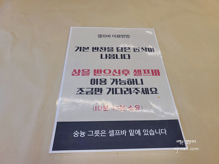 미역국이나 숭늉도 따로 가마솥에 끓여져 있어 필요한 만큼 갖다 먹으면 된다. 셀프바 메뉴는 두부조림, 잡채, 양배추쌈, 미역국 그리고 다양한 반찬들이 있다.