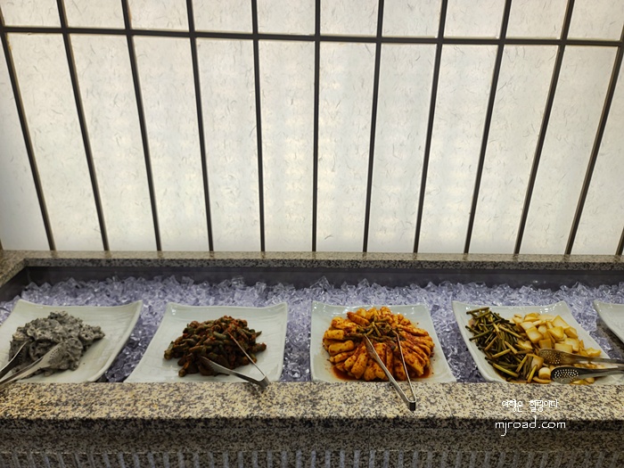 미역국이나 숭늉도 따로 가마솥에 끓여져 있어 필요한 만큼 갖다 먹으면 된다. 셀프바 메뉴는 두부조림, 잡채, 양배추쌈, 미역국 그리고 다양한 반찬들이 있다.