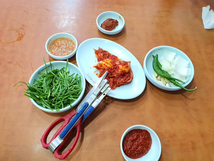 돼지국밥 두 그릇을 주문하니 부추, 고추,양파 그리고 김치가 나왔습니다. 김치는 갓 무친것처럼 길죽하게 나왔는데 손님이 직접 가위로 먹기 좋게 잘라 먹어야 합니다. 사실 이런 김치는 손으로 죽죽 찢어 먹으면 더 맛있긴 하지만요.