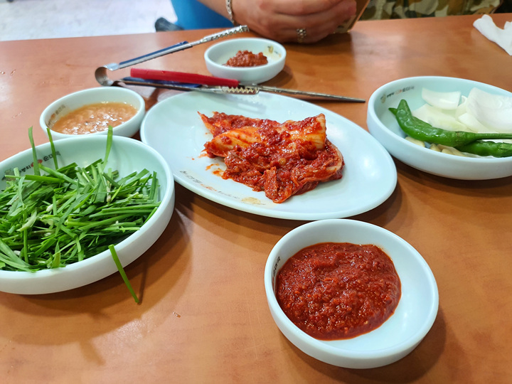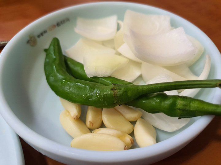 돼지국밥 두 그릇을 주문하니 부추, 고추,양파 그리고 김치가 나왔습니다. 김치는 갓 무친것처럼 길죽하게 나왔는데 손님이 직접 가위로 먹기 좋게 잘라 먹어야 합니다. 사실 이런 김치는 손으로 죽죽 찢어 먹으면 더 맛있긴 하지만요.