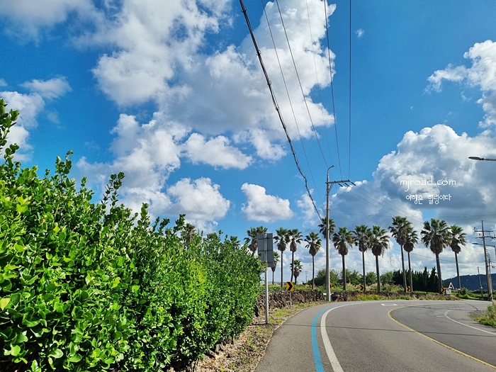 제주도답게 야자수도 도로옆을 장식하니 이국적인 모습은 저리 가라고 할 정도이다. 상쾌한 공기와 걷기 좋은 습도와 기온이 온몸을 감싸니 기분까지 좋아지는 시너지 효과를 얻게 되고 건강까지 챙기게 된다.