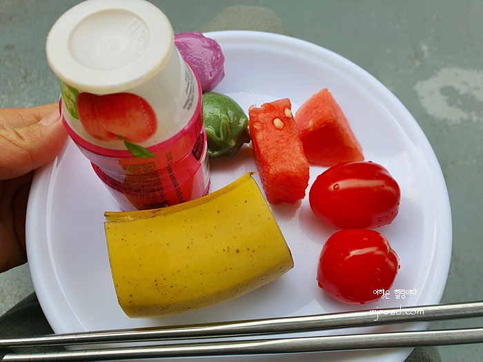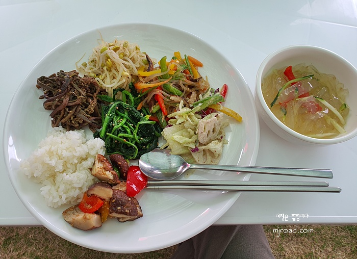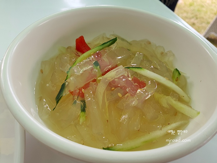 푸짐하게 한 접시을 담고 있으니 우뭇가사리 냉채 한 그릇도 담아 주셨다. 평소 잘 안 먹는 음식이었는데 이곳에서 먹으니 눈 깜짝 할사이에 다 먹을 정도로 맛있었다. 날씨가 선선해 야외에서 먹기도 딱 좋았다.