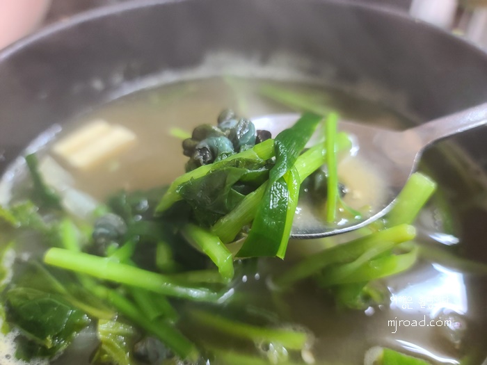 주문한 음식이 나왔다. 생각보다 큰 뚝배기에 한가득 나왔다. 생각보다 많은 양에 놀랐다. 신선한 채소와 다슬기, 재첩이 그냥 보기에도 보일 정도로 푸짐하게 들어 있었다.