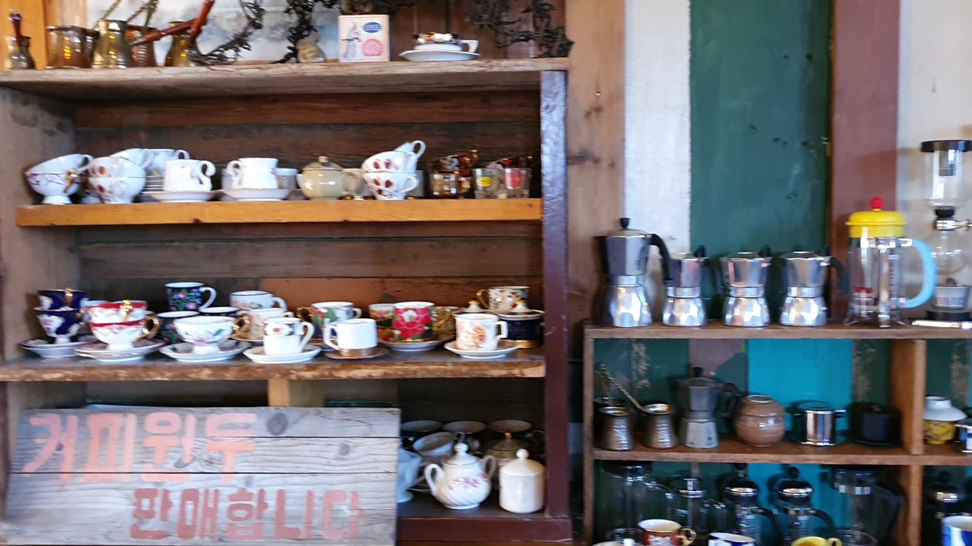 오르막을 한참 오르고야 눈에 띈 오래되어 보이는 커피숍이다. 사실 밖에서 커피숍인지 모르고 봤다면 그냥 창고 같아 보이는 느낌이었다.